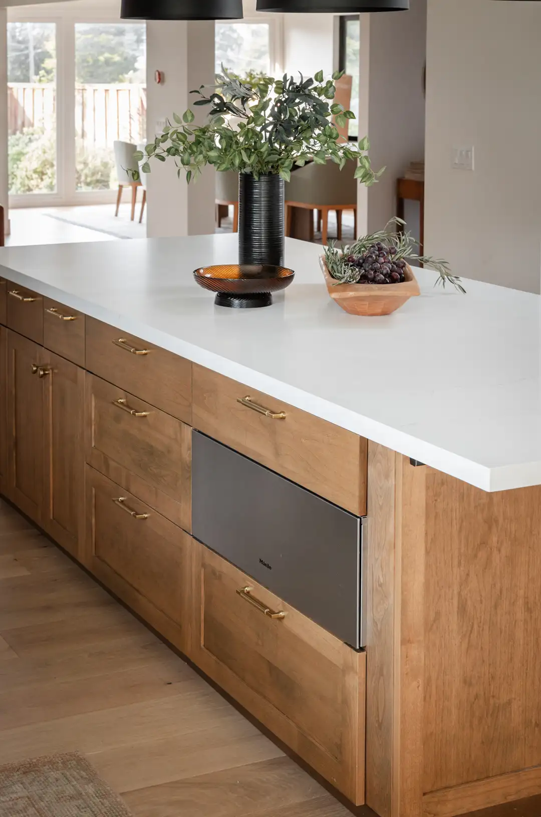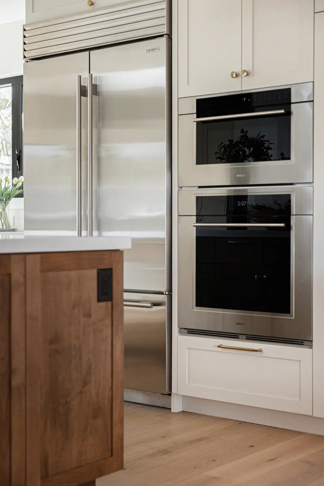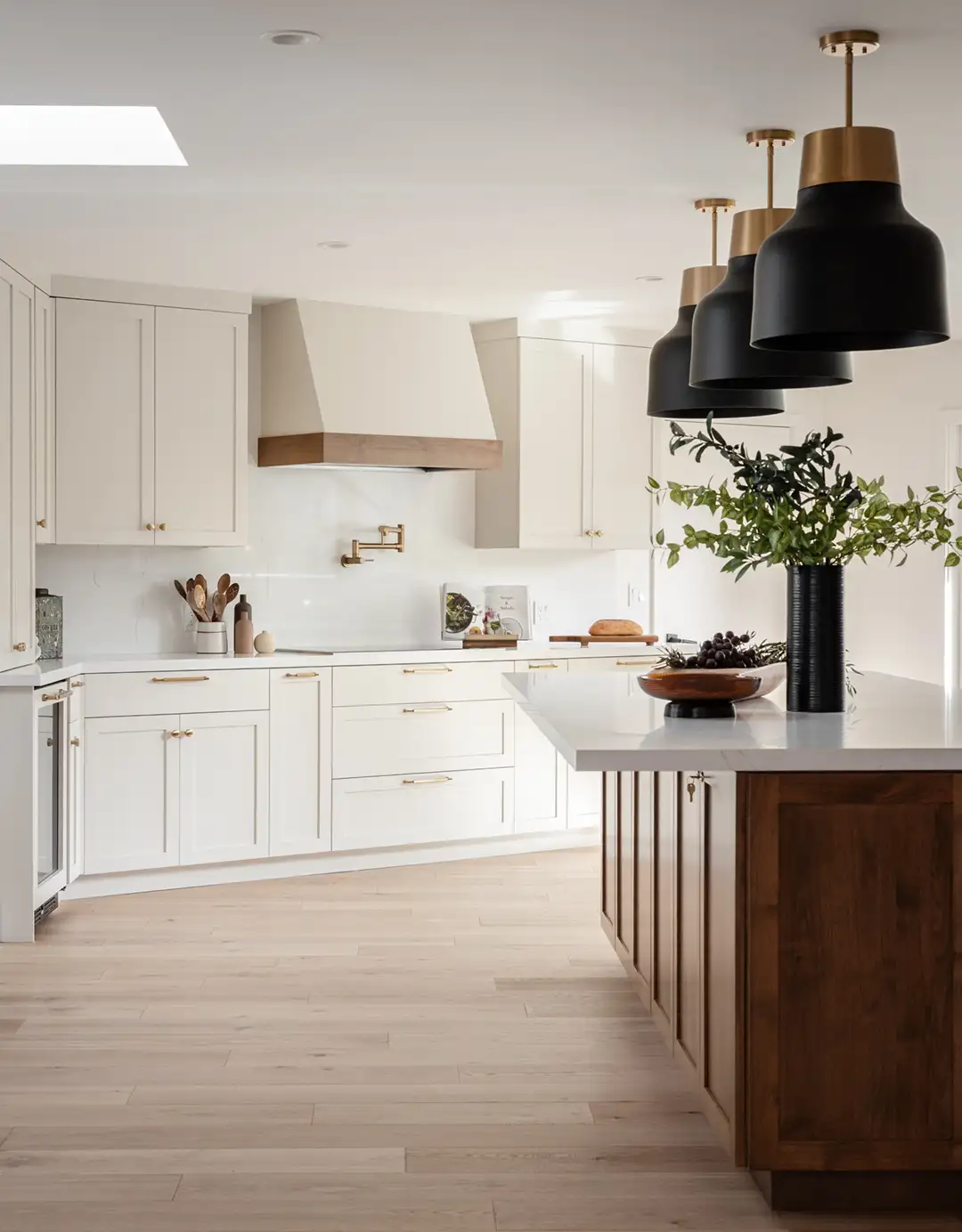 To achieve a refined Coastal Transitional aesthetic, we layered custom finishes throughout. Schmitz-built cabinetry blends painted surfaces with natural Alder wood for warmth and depth. Quartz countertops extend into a full-height backsplash for a clean, slab-style look, while engineered Oak flooring provides timeless durability underfoot.