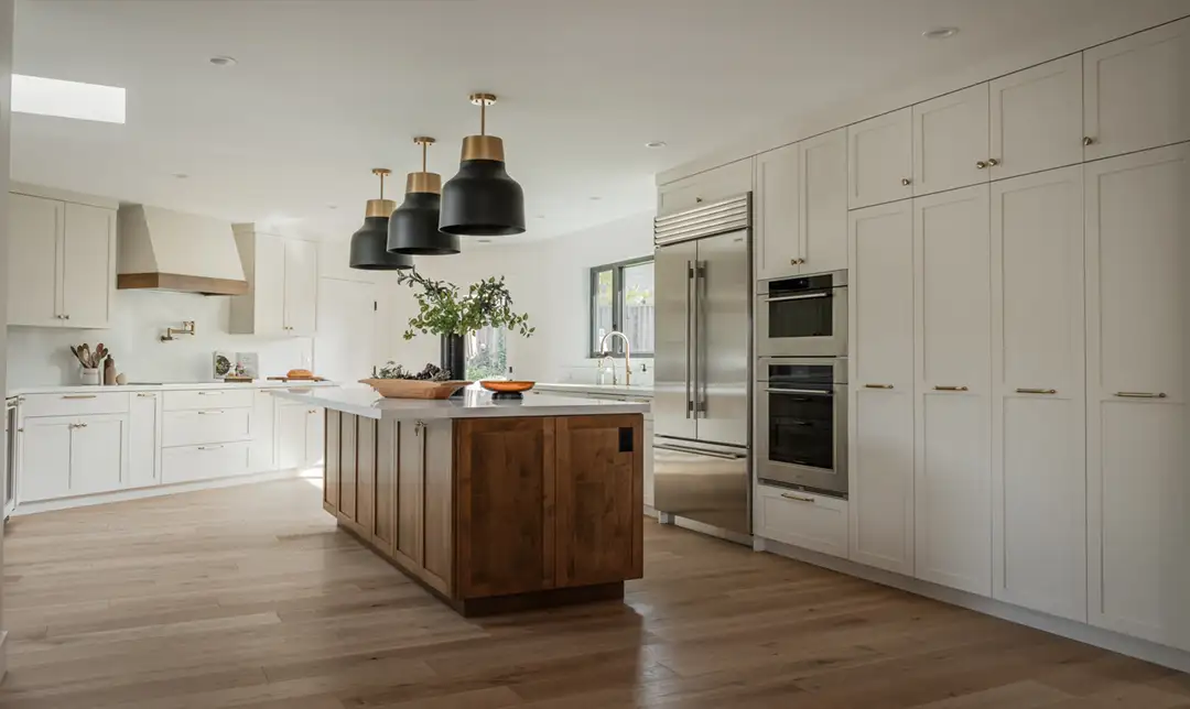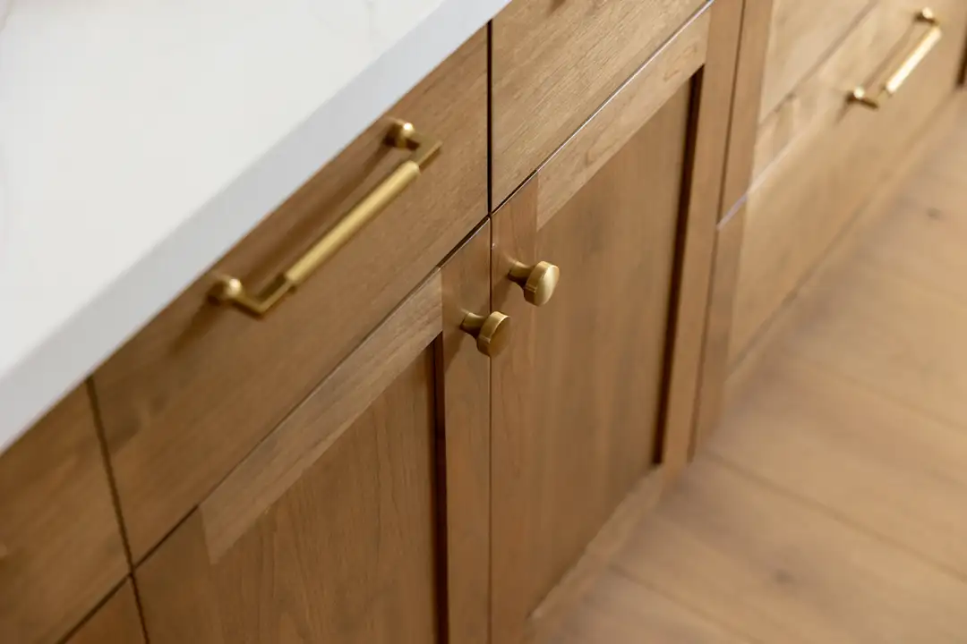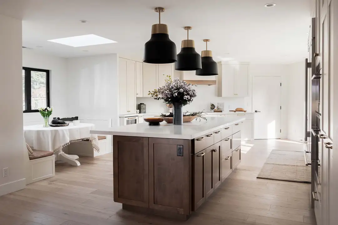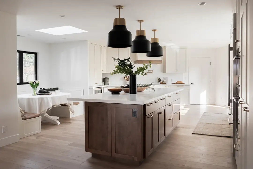To achieve a refined Coastal Transitional aesthetic, we layered custom finishes throughout. Schmitz-built cabinetry blends painted surfaces with natural Alder wood for warmth and depth. Quartz countertops extend into a full-height backsplash for a clean, slab-style look, while engineered Oak flooring provides timeless durability underfoot.