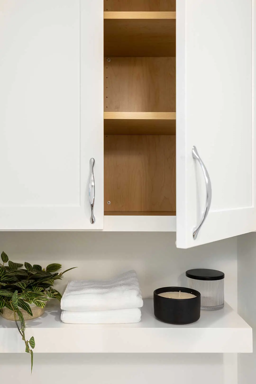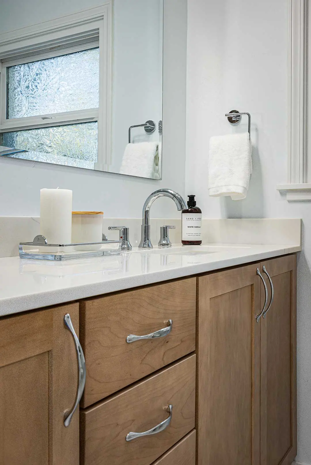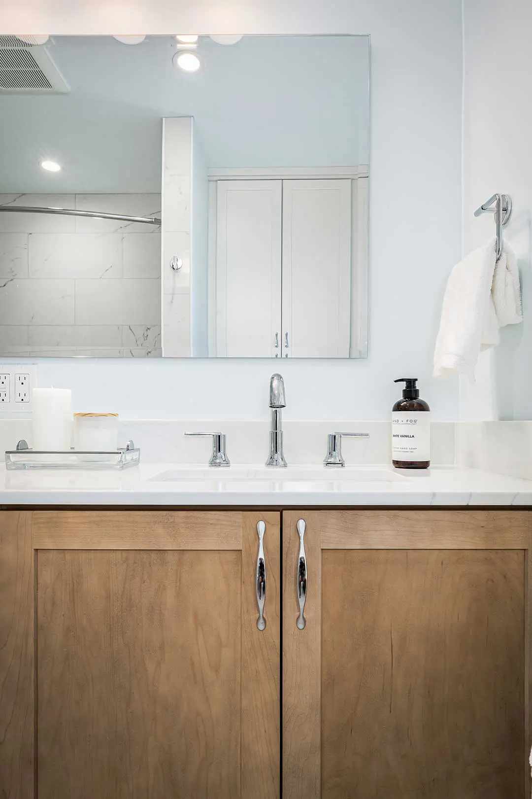 The completed bathroom is bright, minimal, and thoughtfully refreshed. Fully integrated storage replaces the former mix of loose cabinets, creating a cleaner and more spacious feel. Updated finishes elevate the room and bring this secondary bathroom up to the same standard as the primary bath Talmadge previously remodeled for the homeowner. The result is a clean, cohesive, and comfortable space that will serve the family beautifully for years to come.