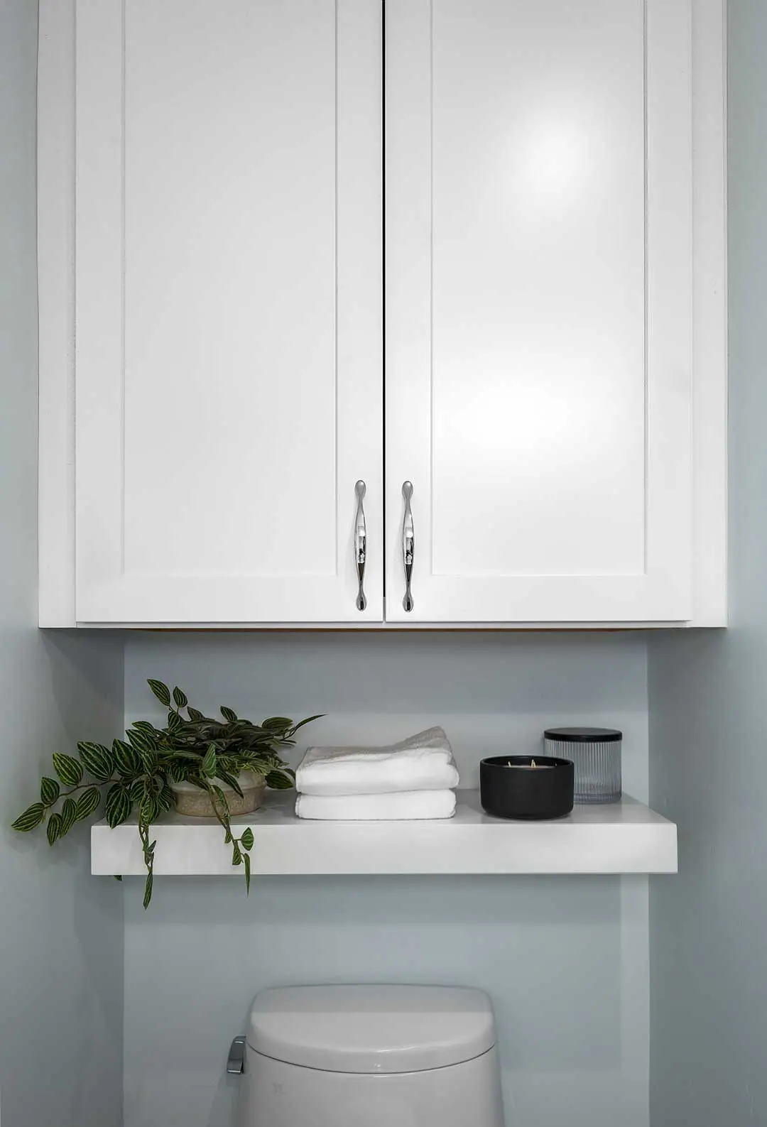 Over time, the hall bathroom had accumulated a patchwork of temporary storage solutions, including loose cabinets, additional shelving, and other makeshift fixes, which resulted in a cluttered and disjointed feel. The finishes were worn, the lighting insufficient, and the layout no longer supported daily use. With young grandchildren visiting often, the homeowners also wanted a space that was easy to maintain, safe, and comfortable for all ages.