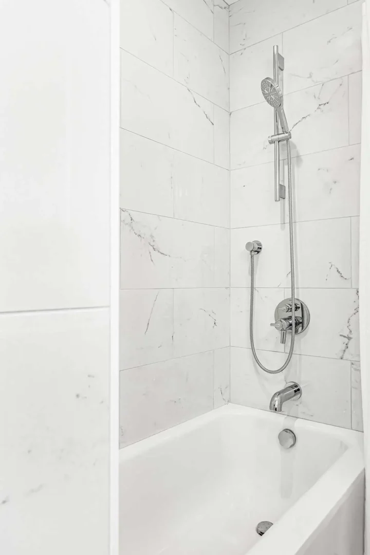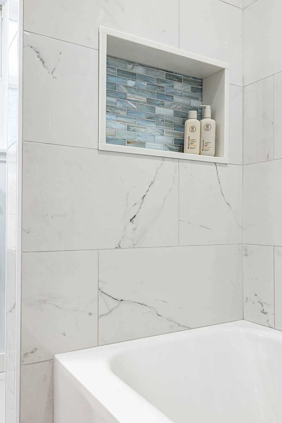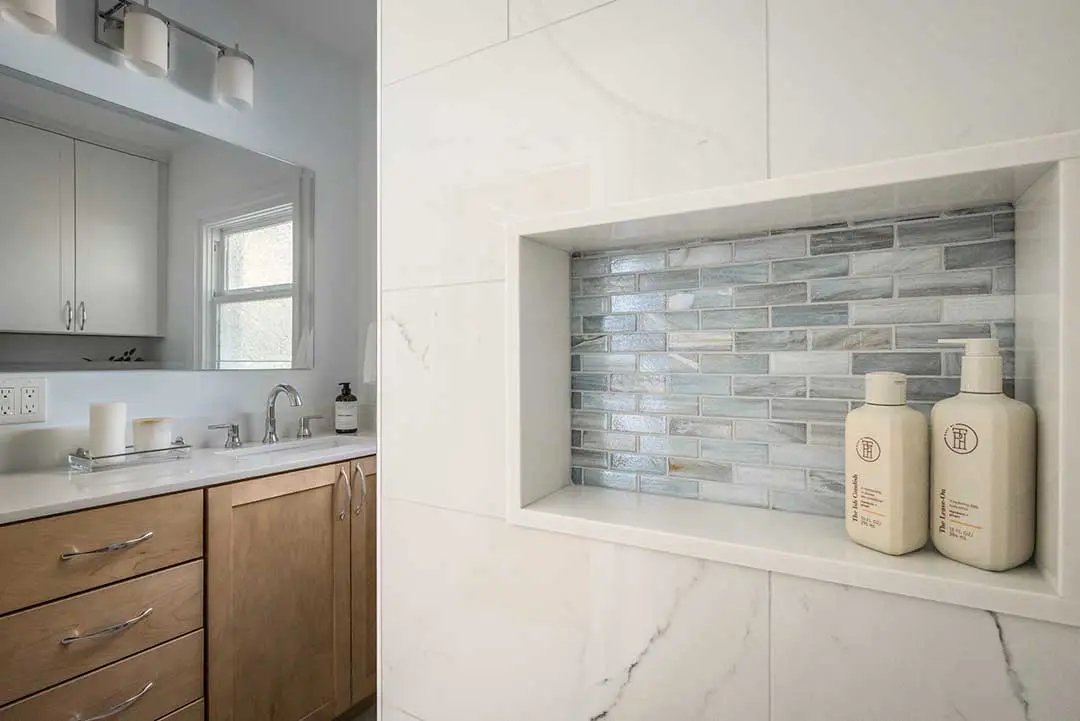 - A recessed shower niche for streamlined storage
