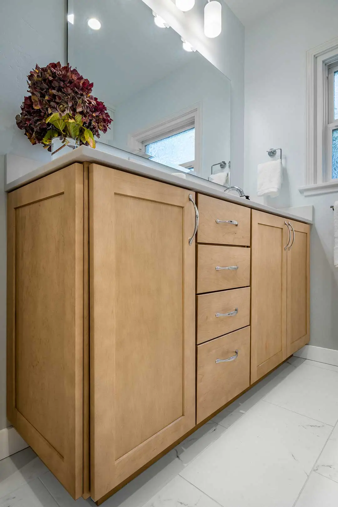 - Semi-custom wood vanity cabinetry in a warm finish for unified, ample storage